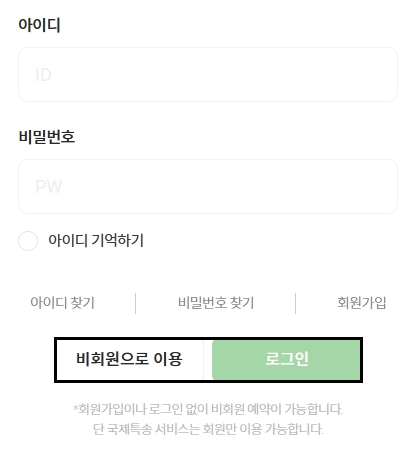 로그인 후 회원으로 접수하거나 비회원으로 이용할 수 있는데요, 국제특송 서비스는 회원만 이용이 가능합니다. 회원접수시 아이디와 비밀번호를 입력하고 [로그인] 버튼을 눌러주세요.