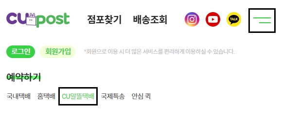씨유포스트 페이지에 접속해서 씨유알뜰택배 또는 씨유끼리택배 접수 및 예약하는 방법에 대하여 알아보겠습니다. 메인화면 상단의 맨 우측에 있는 메뉴를 선택하고 [예약하기] 항목의 [CU알뜰택배] 항목으로 들어갑니다. 해당 서비스는 편의점 자체 물류망을 활용하여 편의점에서 편의점으로 배송되는 서비스입니다.