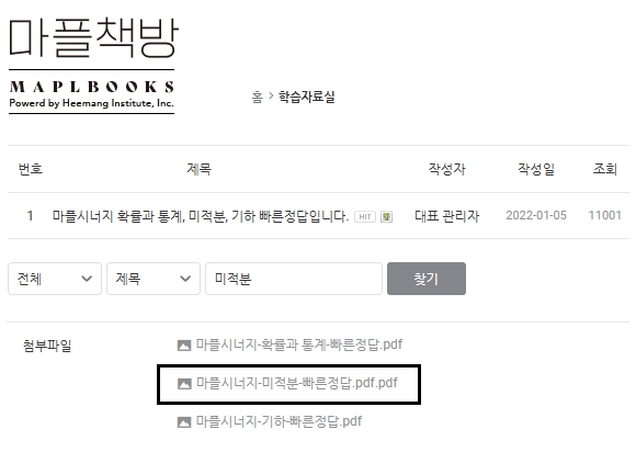 오늘은 마플책방 또는 마플북스 홈페이지(마플북스 홈페이지에 오신것을 환영합니다! (mapl.co.kr))에 접속하여 마플시너지 미적분 답지 다운로드하는 방법에 대하여 알아보고, 교재에 대한 특징도 살펴보도록 하겠습니다.