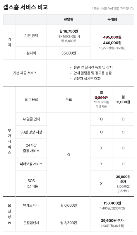 캡스홈 서비스 이용료 정보는 아래 표를 참고하세요. 모든 비용은 부가세가 포함된 가격이고, 할부계약은 종료되는 즉시 고객의 소유로 이전됩니다.