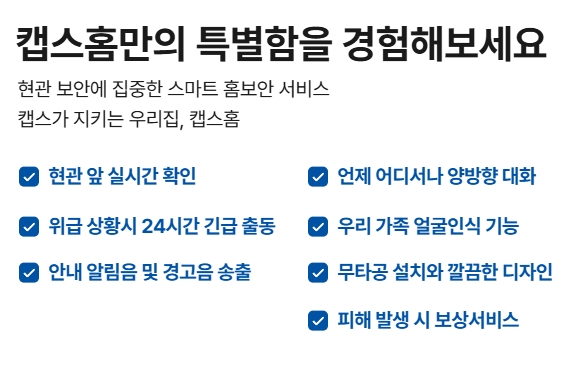 대화가 어려운 상황에 대한 알림음 및 위험한 상황에 경고/사이렌을 송출할 수 있고, 집을 비워도 방문자와 캡스홈 앱으로 음성대화가 가능합니다. AI기술을 통한 가족구성원 얼굴인식으로 출입을 감지할 수 있습니다.