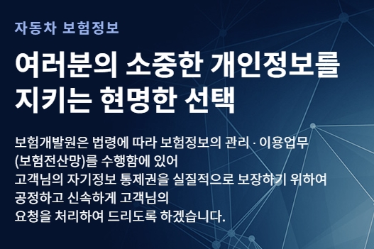 보험개발원은 법령에 따라 보험정보의 관리 및 이용업무(보험전산망)를 수행함에 있어서 고객의 자기정보 통제권을 실질적으로 보장하기 위하여 공정하고 신속하게 고객의 요청을 처리해 드리고자 합니다.