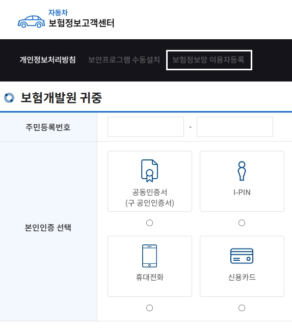 홈페이지를 이용을 위해서는 타인에 의한 고객님의 보험정보 누출을 방지하기 위하여 본인인증(공동인증서, 아이핀, 휴대폰, 신용카드 중 택1) 과정을 반드시 거쳐야 합니다.