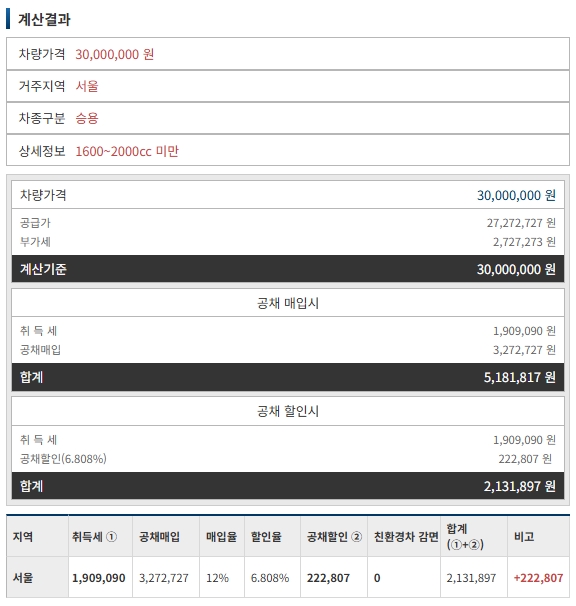 계산 결과 예시는 아래 그림을 참고하시기 바랍니다. 차량가격(공급가+부가세), 공채 매입시 취득세와 공채 매입비, 공채 할인시 취득세와 공체할인율 정보를 확인할 수 있습니다.
