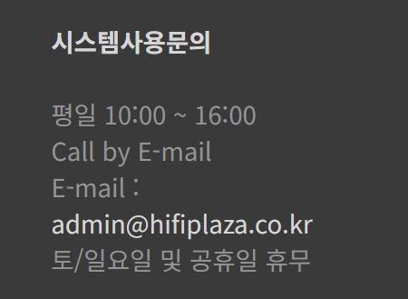 기타 하이파이플라자 서비스 이용과 관련하여 기타 문의사항이 있으시면 이메일주소 admin@hifiplaza.co.kr으로 연락하시기 바랍니다. 운영시간은 평일 10시부터 16시까지이며, 토/일요일 및 공휴일은 휴무입니다.