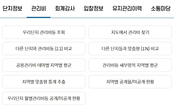조회 가능 항목은 우리단지 관리비등 조회, 지도에서 관리비 찾기, 다른 단지와 관리비등 (1:1)비교, 다른 단지들과 맞춤형 (1:N)비교, 공용관리비 테마별 지역별 평균, 관리비등 세부항목 지역별 평균, 지역별 맞춤형 통계 추출, 지역별 공개율/미공개 현황, 우리단지 월별관리비등 공개/미공개 현황이 있습니다.