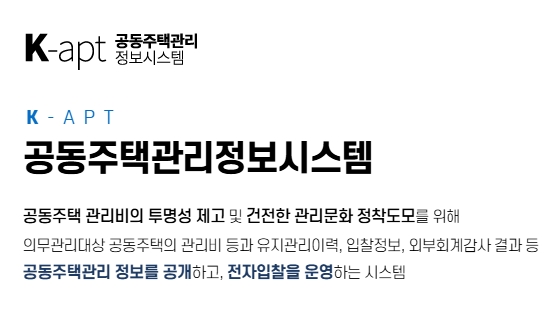 K-apt 또는 케이 아파트 공동주택관리 정보시스템은 공동주택 관리비의 투명성 제고 및 건전한 관리문화 정착도모를 위하여, 의무관리대상 공동주택의 관리비 등과 유지관리이력/입찰정보/외부회계감사결과 등 공동주택관리 정보를 공개하고, 전자입찰을 운영하는 시스템입니다.