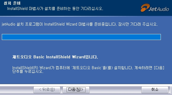 인스톨 과정도 간단히 보여드리겠습니다. jetAudio 설치프로그램이 인스톨쉴드 마법사를 준비하고 있는데요, 잠시 기다려주시면 [다음] 버튼을 누를 수 있습니다.