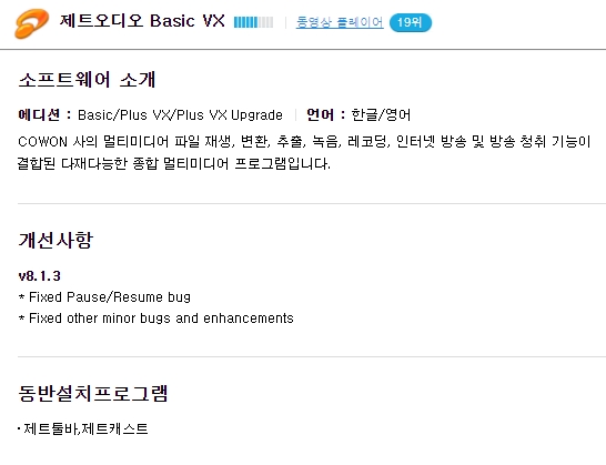 COWON사의 멀티미디어 파일재생, 변환, 추출, 녹음, 레코딩, 인터넷방송 및 방송청취 기능이 결합된 다재다능한 종합 멀티미디어 프로그램입니다. 버전업에 따른 개선사항을 확인할 수 있으며, 동반설치 프로그램으로 제트툴바와 제트캐스트가 있습니다.