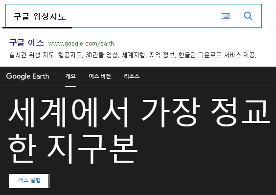 우리나라 지도만 볼때에는 네이버나 카카오맵도 충분하지만, 세계지도를 보려면 역시 구글을 이용할수밖에 없을 것 같습니다. 포털이나 검색엔진 등을 활용하여 위의 그림처럼 키워드를 잡고 검색합니다. 페이지에 접속하면 세계에서 가장 정교한 지구본이라는 문구가 있는데요 [어스 실행] 버튼을 눌러줍니다.
