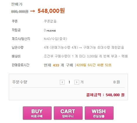 원래는 88만원짜린데 현재 548000원에 판매하고 있네요. 쿠폰, 적립금, 제조사, 원산지, 남은수량, 배송비, 판매종료시간 정보를 확인할 수 있습니다. 바로구매를 하거나 장바구니에 담거나 관심상품에 추가할 수 있어요.