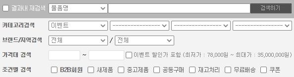 결과내 재검색을 할수도 있는데요, 물품명을 선택하거나 카테고리검색을 할 수 있습니다. 또한 브랜드, 지역, 가격대, 조건별 검색을