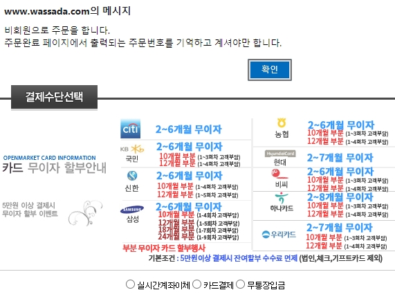 로그인을 하지 않아도 구매가 가능한데요, 다만 비회원으로 주문하면 주문완료 페이지에서 출력되는 주문번호를 기억하고 있어야 합니다. 결제수단은 실시간계좌이체, 카드, 무통장입금 중 선택할 수 있어요. 5만원 이상 결제시 무이자 할부 이벤트도 진행하고 있네요.