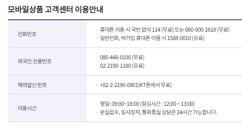 모바일상품 고객센터는 전화번호, 외국인 전용번호, 해외발신번호로 구분되어 있습니다. 이용할 수 있는 시간은 평일 09시~18시까지이고, 점심시간은 12~13시까지입니다. 분실접수, 일시정지, 통화품질 상담은 24시간 이용할 수 있습니다.