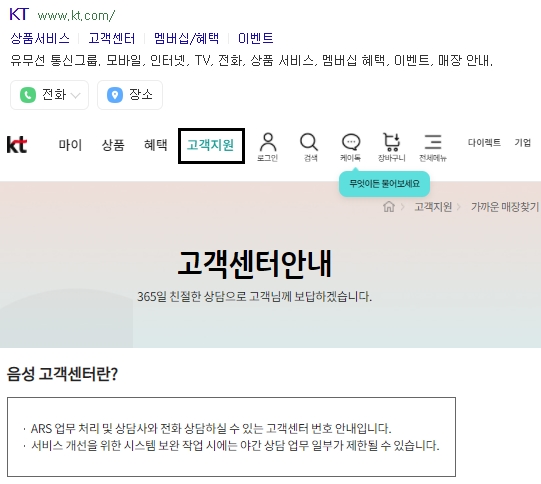 케이티 홈페이지에 접속하시면, 메인화면 상단에서 [고객지원] 메뉴를 이용할 수 있습니다. 365일 친절한 상담으로 고객에게 보답하겠다는 문구가 적혀있네요. 음성 고객센터란 ARS 업무처리 및 상담사와 전화상담을 할 수 있는 고객센터 번호 안내입니다. 서비스 개선을 위한 시스템 보완 작업시에는 야간상담 업무가 일부 제한될 수 있어요.