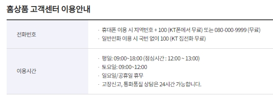 홈상품 고객센터 이용을 위한 전화번호 안내가 되어있습니다. 이용시간은 평일 09시부터 18시까지이며, 점심시간은 12~13시까지입니다.
