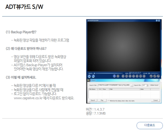 백업 플레이어란 녹화된 영상파일을 재생하기 위한 프로그램입니다. 영상보안을 위하여, 다운받은 녹화영상 파일은 암호화 되어있습니다. ADT캡스 백업 플레이어가 설치되어 있어야만 녹화영상을 재생할 수 있어요.