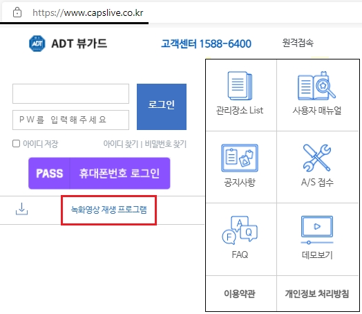 메인화면에는 고객센터 전화번호와 원격접속 메뉴가 있습니다. 관리장소 리스트, 사용자 매뉴얼, 공지사항, A/S 접수, FAQ, 데모보기 메뉴도 있으며 이용약관과 개인정보 처리방침을 확인할 수 있습니다. 아이디와 패스워드를 입력하여 로그인 할 수 있고 [녹화영상 재생 프로그램] 항목을 눌러서 해당 소프트웨어를 다운받을 수 있어요.