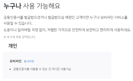 공동인증서를 발급받았거나 발급받을 예정인 고객이라면 누구나 모비사인 서비스를 사용할 수 있습니다. 도용이나 잃어버릴 걱정없이 저렴한 가격으로 안전하게 보관하고 편리하게 사용해보세요. 이용료는 개인 기준으로 부가세를 포함하여 월 990원이고, 공동인증서를 사용할 수 있는 곳 어디든 사용이 가능합니다.