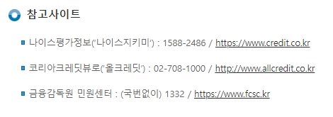 참고사이트로는 나이스평가정보의 나이스지키미, 코리아크레딧뷰로의 올크레딧, 금융감독원 민원센터가 있습니다. 사이트 주소와 연락처 정보가 있으니 확인하시기 바랍니다. 마지막으로는 개인신용등급 관리의 필요성에 대해서 알아보겠습니다.