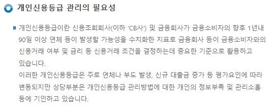 개인신용등급은 금융회사 등이 금융소비자와의 신용거래 여부 및 금리 등 신용거래 조건을 결정하는데 중요한 기준을 활용하고 있습니다. 주로 연체나 부도발생, 신규대출금 증가 등 평가요인에 따라서 변동되지만 상당부분은 개인신용등급 관리방법에 대한 개인의 정보부족 및 관리소홀 등에 기인하고 있다고 하니 평소에 관리를 잘 하는것이 중요하겠습니다.