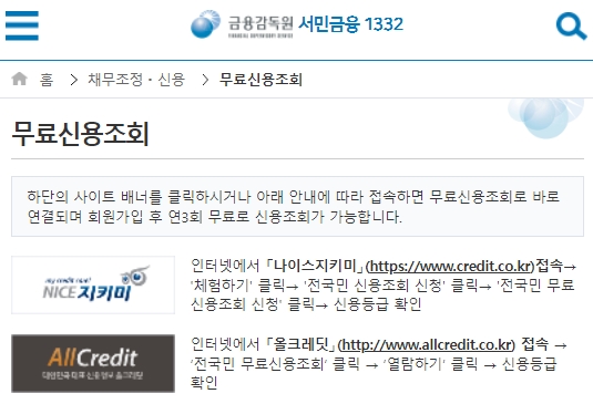서민금융 1332 페이지에서 안내하는 전국민 신용등급 무료조회 방법에 대해서 살펴보겠습니다. 나이스지키미 또는 올크레딧 사이트에 접속해서 무료신용조회를 할 수 있으며, 회원가입 후 연 3회까지 무료로 신용조회를 하실 수 있습니다.